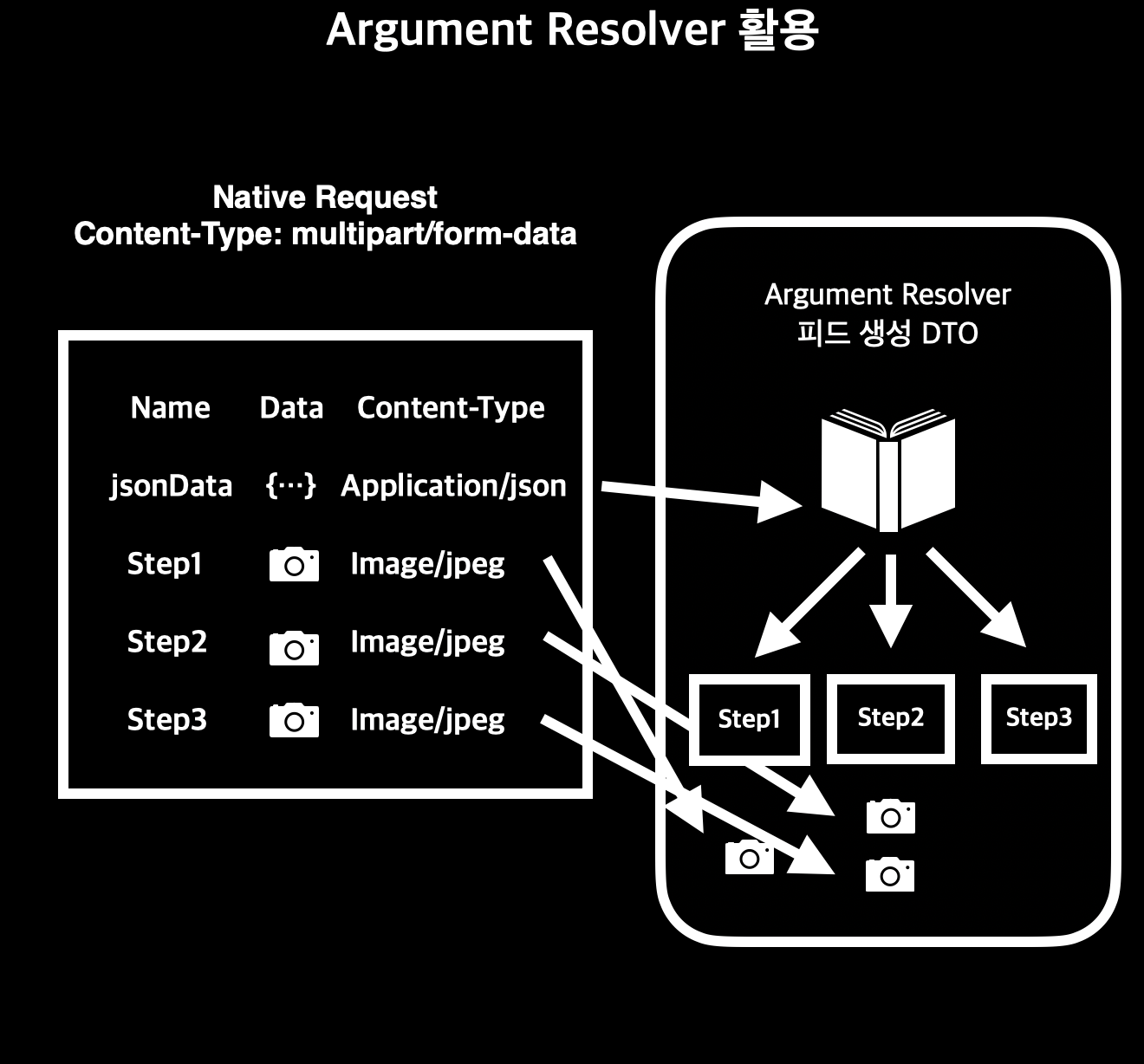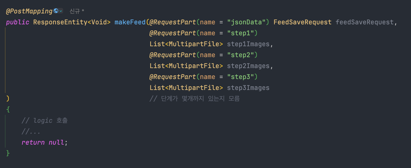 @RequesetPart를 활용할 생각을 해봤지만 애초에 불가능하다. @RequestPart는 name으로 구분지어서 json data, 각 단계의 사진들을 받는다. 하지만 각 단계들이 가변적이다. 그래서 애초에 요청을 만들 수가 없다.