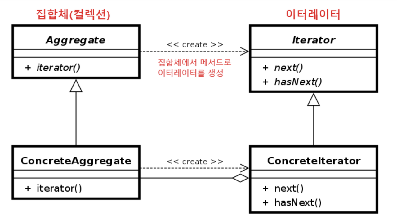 - Aggregate(집합체): 객체들의 집합체를 인터페이스입니다. 이 인터페이스를 구현하는 컬렉션 클래스는 iterator() 메서드를 제공하여 ConcreteIterator 객체를 생성합니다.