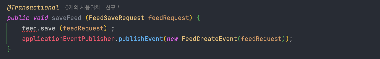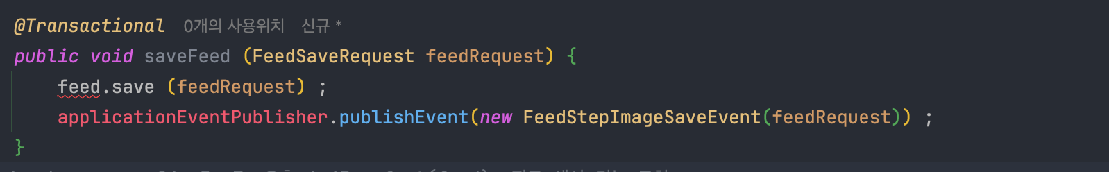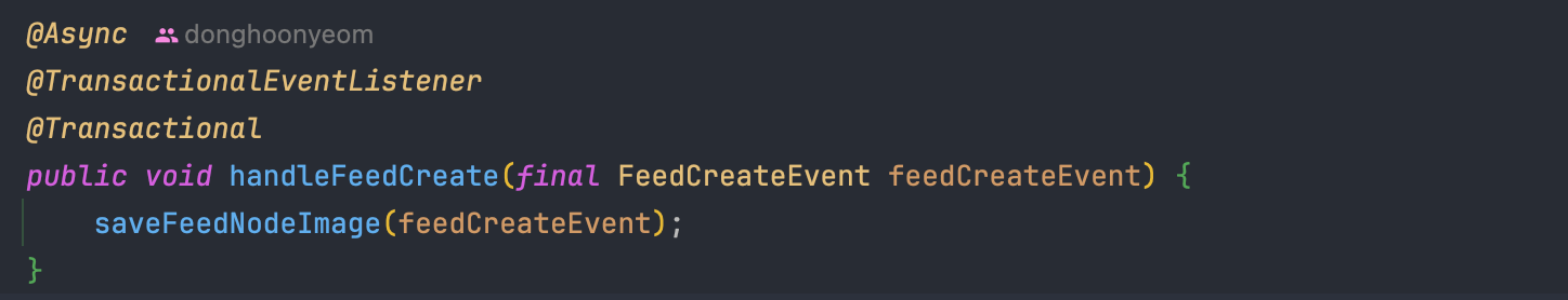 그래서 생각한 방법은 Spring Event를 활용하는 것이었다. 피드를 생성하는 본 로직에서 특정 Event를 발행하고, EventListener에서 파일 I/O를 하는 방법이다.