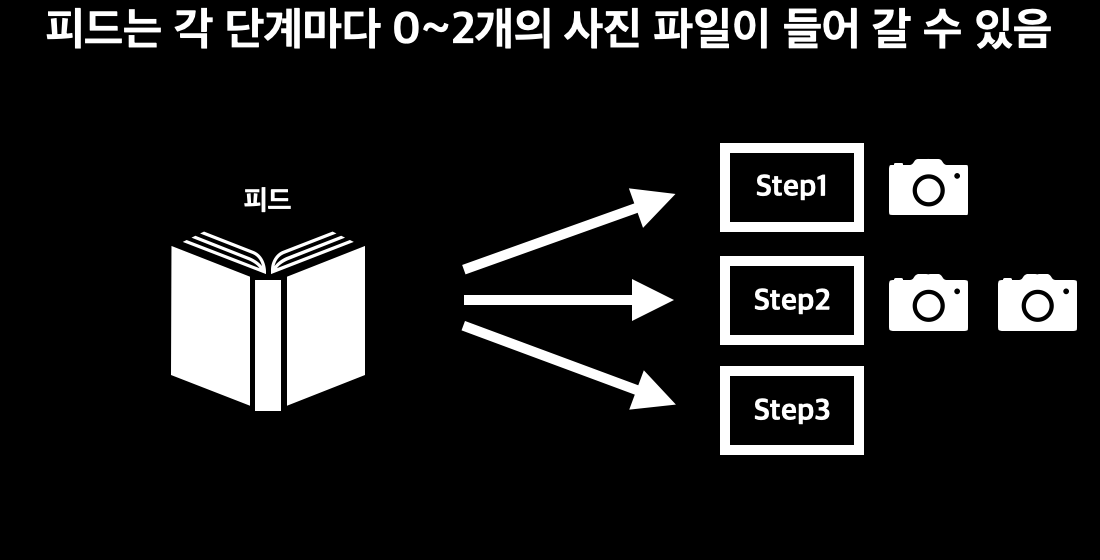 피드를 생성하는 로직이 있다. 이 피드는 각 단계가 있고, 각 단계에 사진 파일이 여러개 저장될 수 있다.