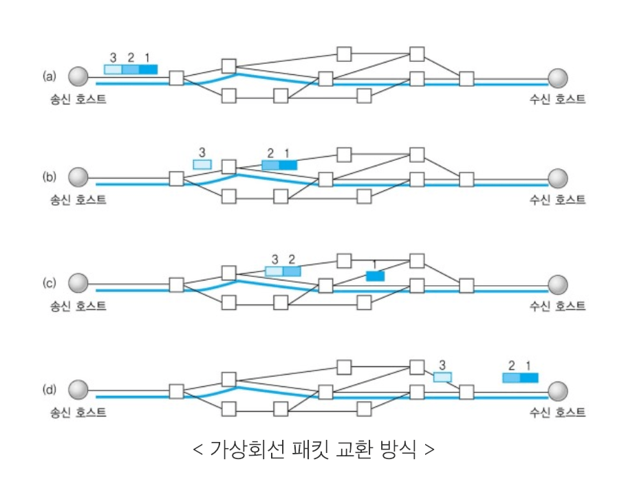 - 가상 회선 패킷 교환 방식 : 데이터를 전송하기 전에 논리적 연결을 설정하게 된다. 이를 가상회선이라 칭한다. 각각의 패킷에는 가상 회선 식별 번호(VCI)가 포함되어 있고, 모든 패킷들을 전송하면 가상회선이 해제되며 패킷들은 전송한 순서대로 도착합니다. (연결 지향)
