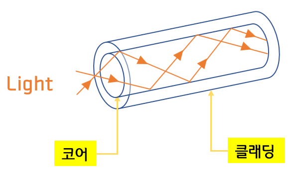 광섬유 케이블은 말 그대로 광섬유를 사용하여 만든 케이블을 말합니다. 빛을 이용하여 통신하기 때문에 과거에 사용했던 동축 케이블이나 구리선과는 비교할 수 없을 만큼의 장거리 통신이나 고속의 통신이 가능합니다. 보통 100 Gbps 속도를 내며, 밑의 그림에서 처럼 광섬유 내에서 빛이 반사하면서 반대편 끝까지 가는 원리입니다. 굴절률이 높은 부분을 코어, 낮은 부분을 클래딩이라고 합니다.