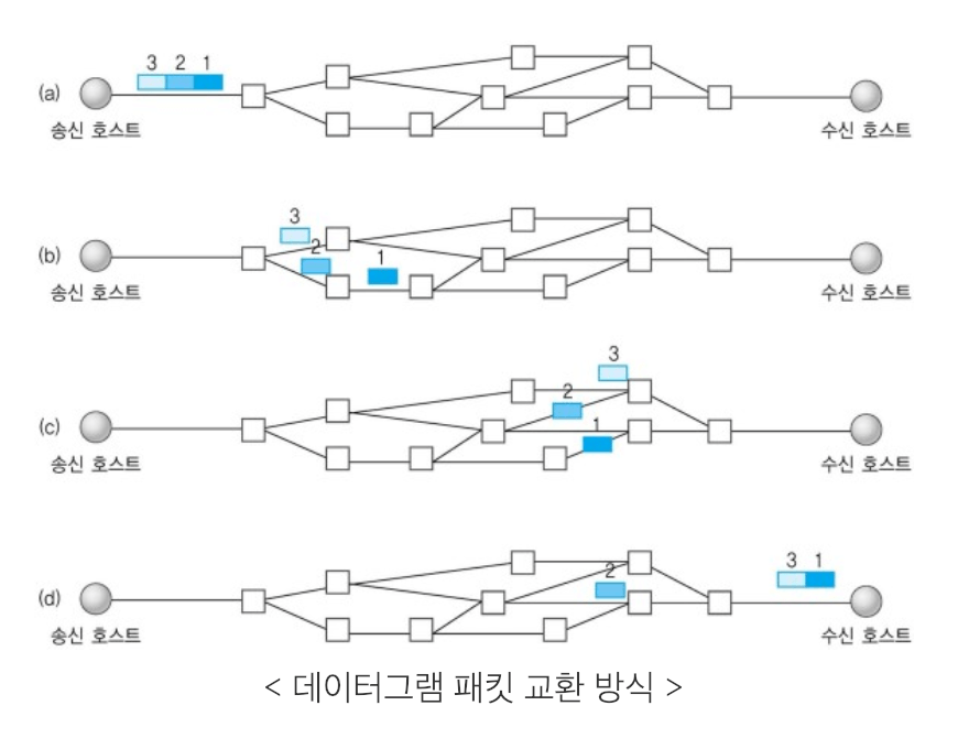 - 데이터그램 교환 방식 : 데이터를 전송하기 전 논리적 연결을 설정하지 않고, 패킷들이 독립적으로 전송된다. 이를 데이터그램이라 칭한다. 패킷을 수신한 라우터는 최적의 경로를 선택하여 패킷을 전송하는데, 하나의 매시지에서 분할되어 있는 여러 개의 패킷은 서로 다른 경로로 전송될 수 도 있습니다. (비연결 지향형)
