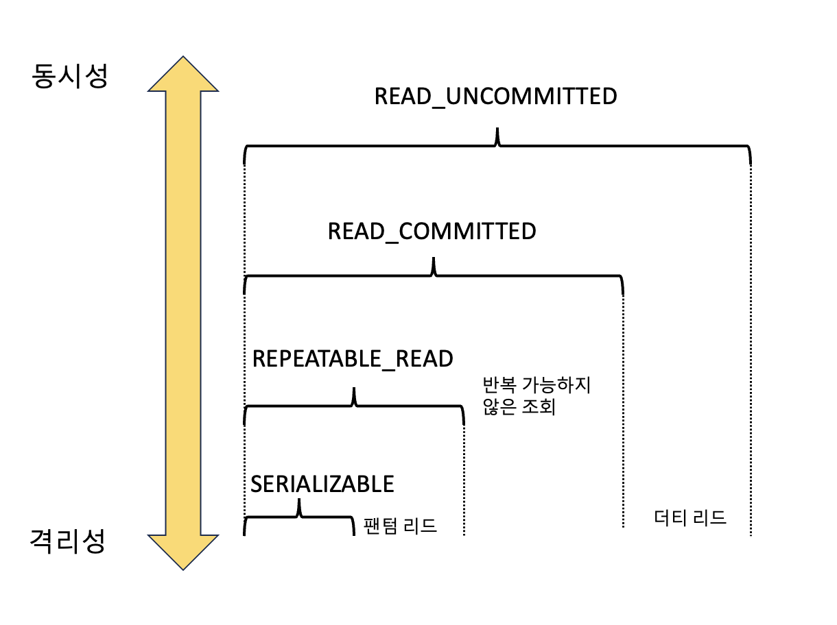 격리 수준은 SERIALIABLE, REPEATABLEREAD, READCOMMITTED, READ_UNCOMMITTED가 있다. 위로 갈수록 동시성은 강해지고, 격리성은 낮아 지고, 아래로 갈수록 격리성은 강해지고, 동시성은 낮아진다.