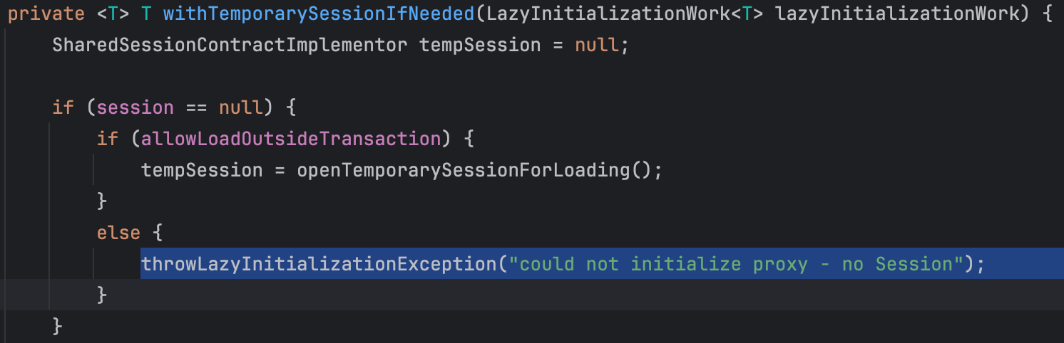그리고, 해당 메서드를 타고 들어가면 session 정보가 없을 때 외부의 트랜잭션을 사용할 수 있는지 판단하는데, 사용 불가능하기 때문에 (allowLoadOutsideTransaction=false) 하단의 else 구문으로 제어가 내려가게 되어 오류가 발생하게 된다.