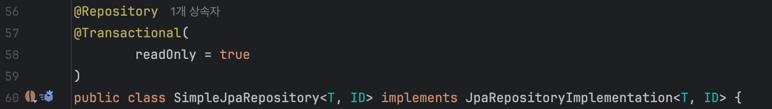 이때, JpaRepository 인터페이스의 구현체인 SimpleJpaRepository 클래스를 가면 위와 같이 @Transactional이 붙어 있는 것을 볼 수 있다. 그렇기 때문에 해당 메서드가 호출하는 시점에 대해서만 트랜잭션이 걸려있게 되는 것이다.