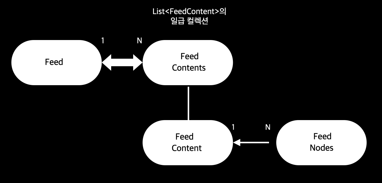 }여기서 봐야하는 점은, 피드(Feed) - 피드 본문(FeedContent)과 피드 본문(FeedContent)과 피드 노드(FeedNode) 모두가 LAZY 전략을 사용하고 있다는 것이다.