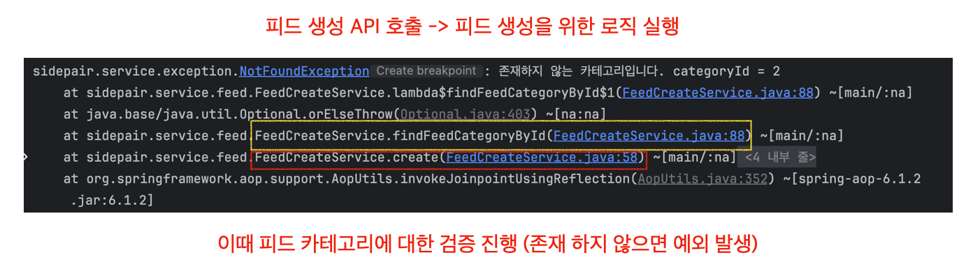 이는, 피드 생성 API가 호출되면서 create 하는 과정에 request body 값으로 받은 피드 카테고리 아이디에 대한 유효성을 검증하게 되고, 해당 로직에서 카테고리 정보가 존재하지 않아 발생한 오류이다.