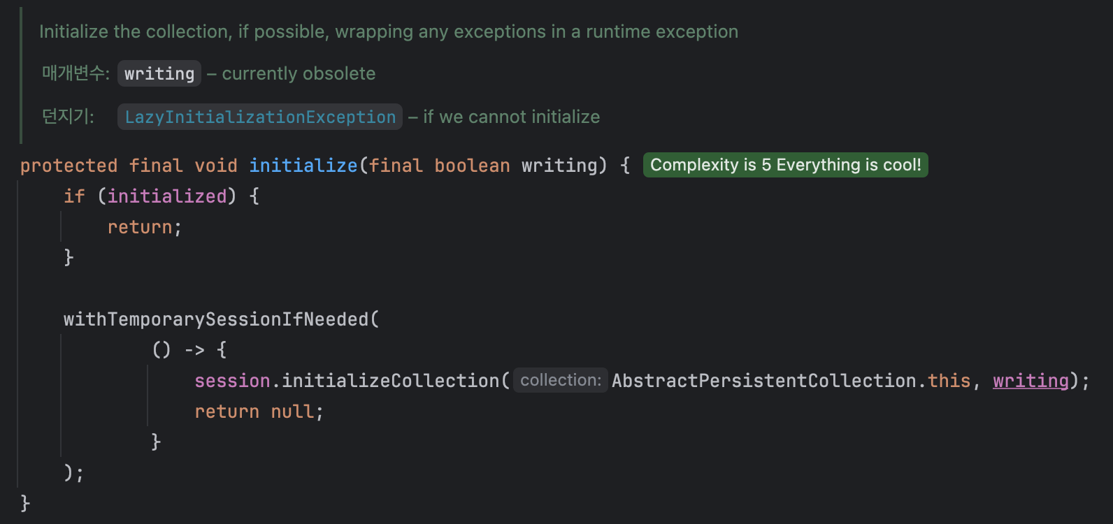 상위의 주석을 잘 읽어보면, 초기화가 불가능할 때 LazyInitializationException이 발생함을 볼 수 있다.
