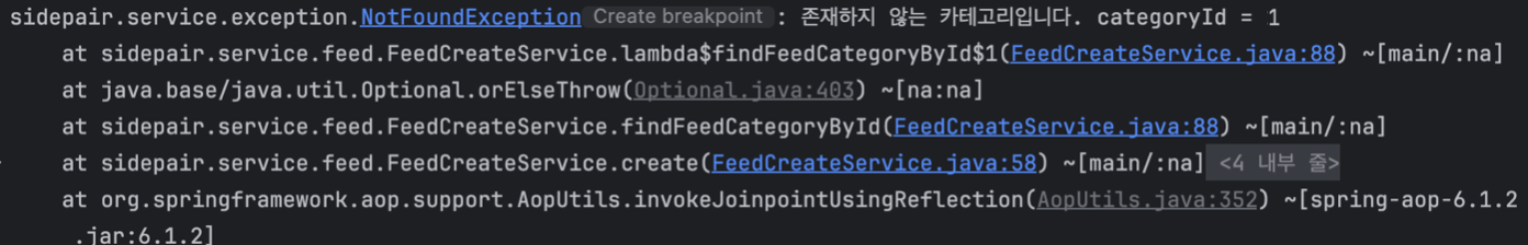 실제로 해당 로그의 상단으로 올라가보면, 위와 같이 카테고리에 대한 Exception이 발생한 것을 볼 수 있다.
